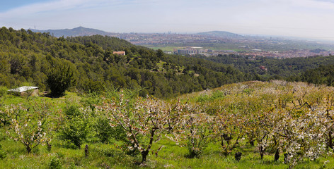 Field of Cherry trees in blossom near Sant Climent, Barcelona province, Spain