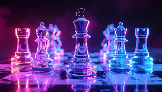 A glowing chess king on a digital, futuristic grid with neon lights and connected nodes.
