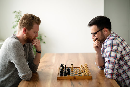 Young man concentrating on chess game. Looking intensely at chessboard with pieces arranged. Leaning over board, in deep thought. Strategic thinking, competition evident. Man likely chess player