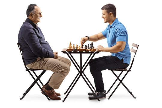 Elderly man sitting at a table and playing chessboard with a younger man