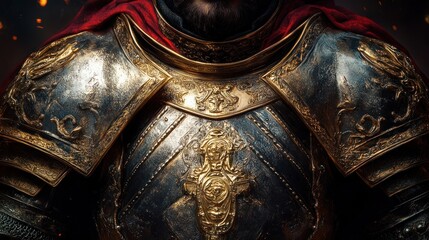 knight clad in armor with a cross embossed on the chest grips a sword, standing resolutely in a lush field. sun sets behind a distant castle, casting a warm glow