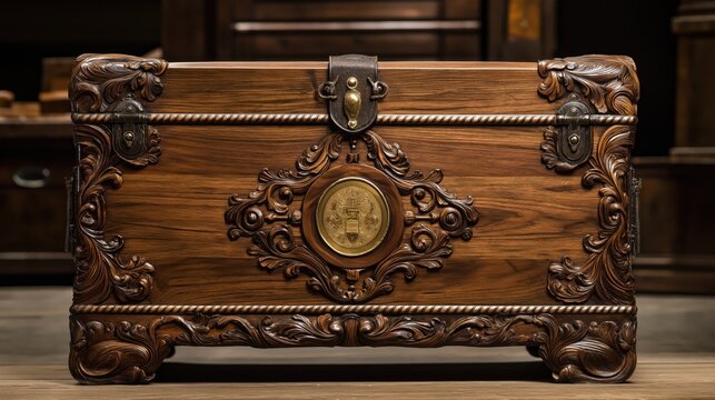 Ornate antique wooden chest with intricate carvings and brass emblem