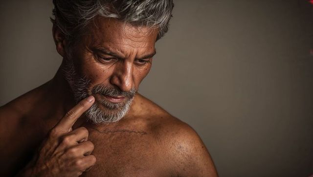 Contemplating bare-chested senior man touching chin with gray beard and weathered skin