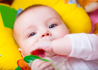 Adorable baby with afrofro munching on a toy in bright bedroom