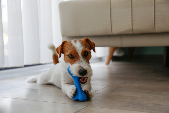 Funny Jack Russell Terrier dog chews a soft toy frog at home on the couch. An active puppy who loves to chew and tear toys