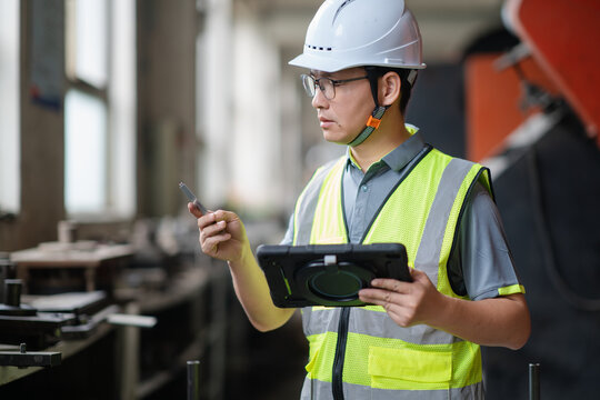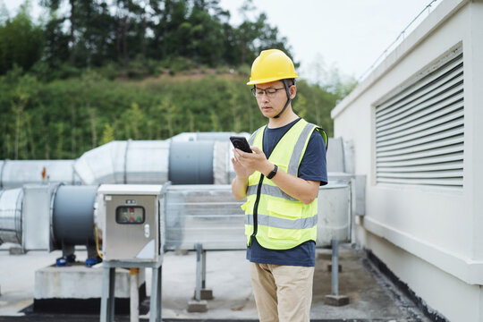 asian engineer working on smart phone with  external unit of commercial air conditioning and ventilation system installed on industrial building roof