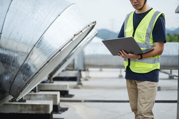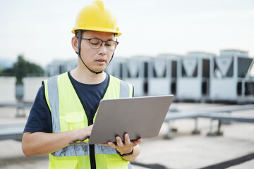 asian engineer working on laptop with  external unit of commercial air conditioning and ventilation system installed on industrial building roof