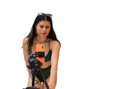 Chica en Bikini verde Creando Contenido Digital con su Teléfono en Estudio. Modelo con Bikini verde Tomando Selfies contra un Fondo Blanco