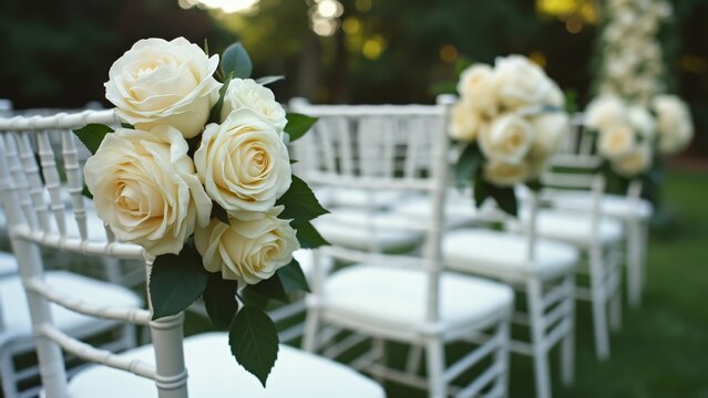 Elegant White Rose Wedding Ceremony Chair Decor, Stunning Floral Arrangements on White Chiavari Chairs on a Lush Green Lawn