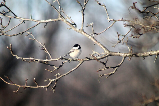 Chickadee perched on bare branch in serene woodland