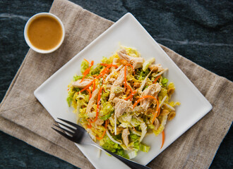 Asian Sesame chicken salad with carrots and ginger dressing.