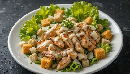 An grilled chicken Caesar salad, featuring crisp romaine lettuce, perfectly grilled chicken strips, shaved parmesan, crunchy croutons, and a creamy Caesar dressing. Shot from a slightly elevated angle