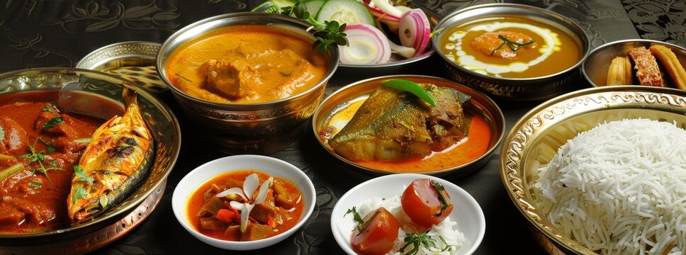 Wide flat lay photograph of delicious biriyani dish on a restaurant table in dark background with curries and gravies around