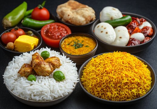 Delicious Indian Thali: Rice, Chicken, Dal, and More