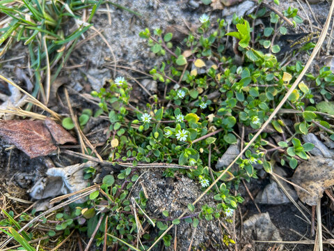 Full frame texture background view of common chickweed flowers (Stellaria media) with tiny white flower blossoms and edible green leaves. Often considered a weed in lawns.
