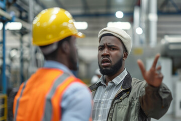 Black male manager scolding an employee in a modern industrial factory. The worker is being corrected for making a mistake.