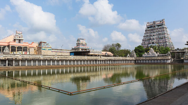 View of Gopuram of Nataraja Temple and Shivgangai Teertham water tank, Chidambaram, Tamilnadu, India