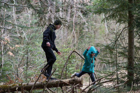 Exploring a tranquil forest with a child as they balance on fallen logs while enjoying the beauty of nature during a cloudy afternoon