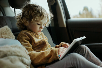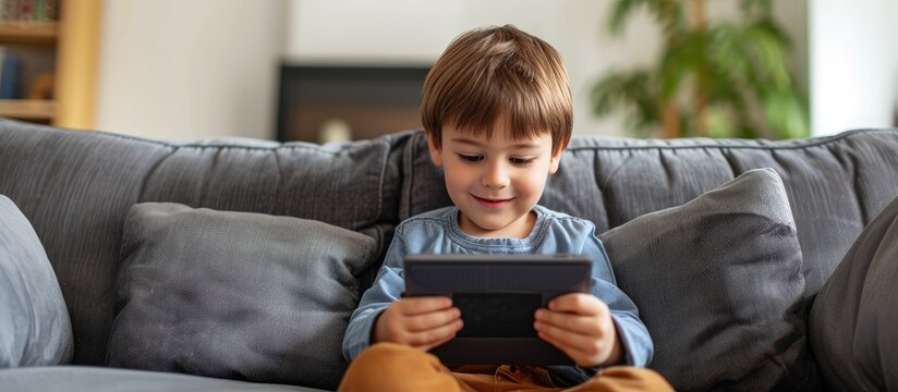 Adorable young child sitting comfortably on a sofa, engaged with a tablet screen in a cozy home environment, learning or playing with technology