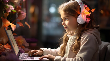 Pretty schoolgirl at a desk, immersed in an online learning session with her laptop, wearing headphones