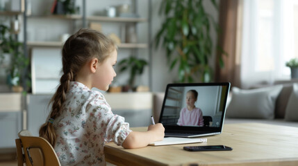 young girl engaged in an online learning session, writing notes while participating in a video call with a teacher on her laptop at a home study setup