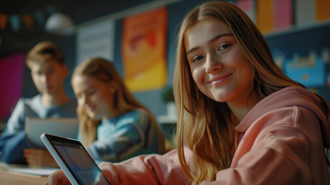 Engaged Students Exploring Interactive Digital Lessons in Vibrant Classroom Setting
