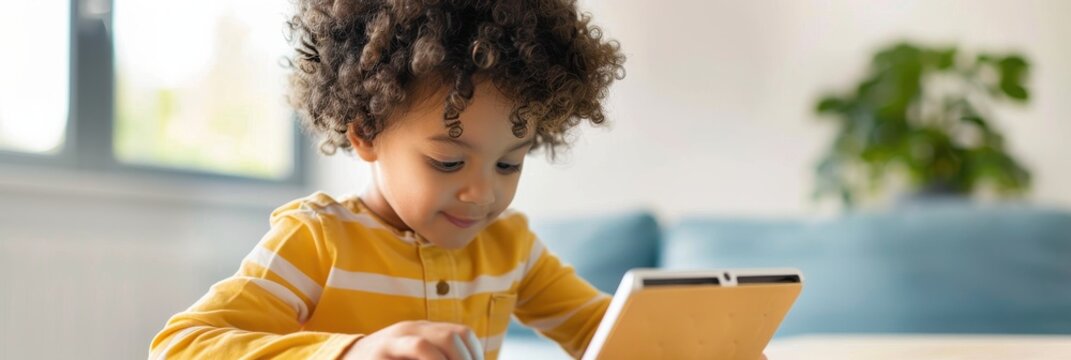 A young child with curly hair engages with a tablet, showcasing curiosity and concentration in a bright, modern living space.