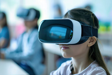 Young girl wearing virtual reality headset in classroom setting