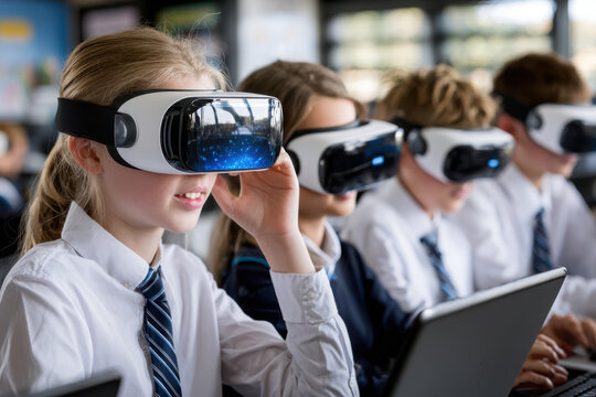 Children engaged in virtual reality learning in a classroom setting