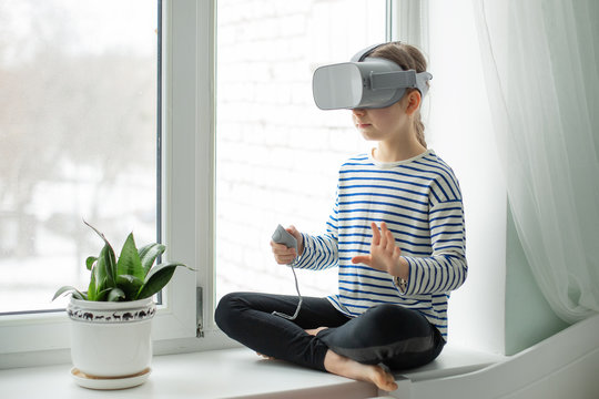 A child with a virtual reality headset is sitting at the table indoors at home. A girl exploring the world of virtual reality through video and games.