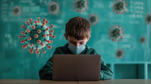 Child learning online with headset and laptop, remote classroom, digital security overlay