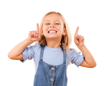 Happiness, portrait and kid girl pointing up at advertising news, discount deal or show youth promo, direction or commercial. Announcement, info and child isolated on transparent, png background