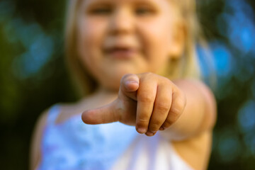 Caucasian little kid girl wearing blue T-shirt standing outdoors pointing displeased and frustrated to the camera, angry and furious ready to fight with you.