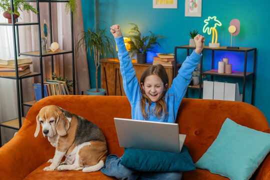 Happy child girl using laptop typing playing browsing found out great big surprise, good positive news, celebrate online game win. Cheerful female preteen kid at home sitting near beagle dog on sofa