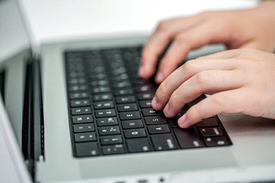 Child Hands typing on the pc keyboard. Close-up shot of kid's hands use computer keyboard.