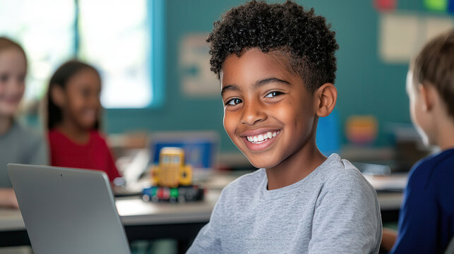 Skills for digital literacy growth. Smiling boy using a laptop in a classroom setting.