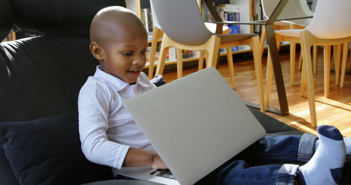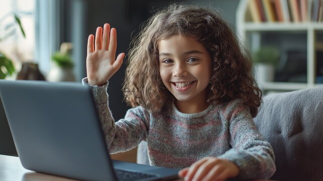 Boy looks at camera while typing on laptop in contemporary workspace with natural light. Cozy atmosphere with indoor plants and wooden shelves. Concept of education, remote work, technology