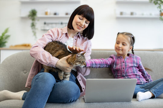 Mother and daughter sitting on couch using laptop while petting cat. Family bonding, technology use, and pet interaction in comfortable home environment.