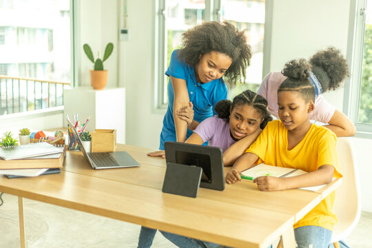 A group of young African kids with their sister use a tablet to communicate with friends. Happy kids use computer at home to socialize with other kids. Technology for education