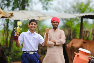 little blonde girl posing with trophy and golden medal and showing thumb up at camera, child sport