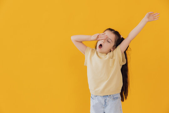 Tired young boy yawning stretching body. Preteen child waking up from nap. Sleepy kid