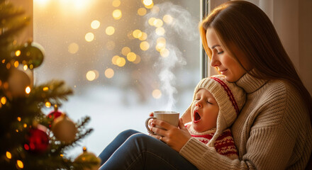 A mother and her child share a warm drink by the window on a snowy Christmas morning
