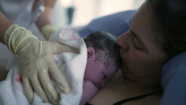 Child birth in maternity hospital. Happy mom with her newborn baby daughter after delivery. Woman giving birth. First moments of baby life after labor.
