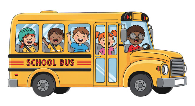 A cartoon school bus with children waving from the windows and a driver with glasses smiling cheerfully