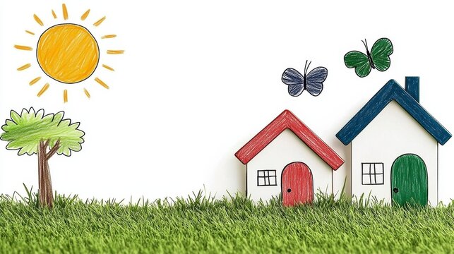 Charming Miniature Houses in a Childlike Drawing Landscape, Evoking Feelings of Home and Joyful Childhood Memories