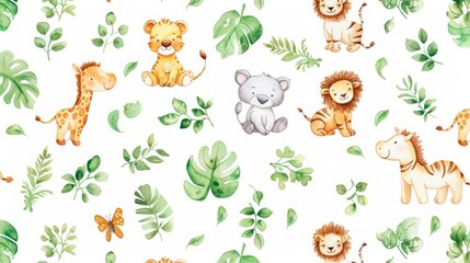 seamless pattern with watercolor cute animals cartoon drawing kids pattern