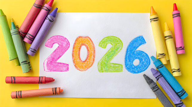 Childs colorful crayon drawing with bright sun, flowers, and geometric shapes on white paper