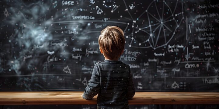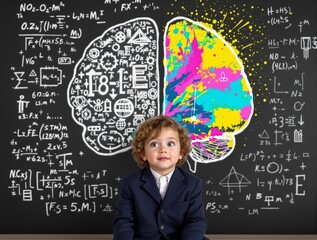 Young boy in formal suit sits before chalkboard with a creative brain illustration, science formulas on background. Concept of intelligence and creativity. Ai generative