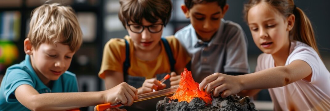 Children in classroom focused on creative paper craft activity. Making origami. Colorful paper, tools like scissors, glue available. Children actively engaged in collaborative learning. Vibrant