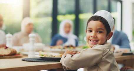 Children, eid and portrait of muslim boy eating food with family in dining room of home for celebration. Dinner, happy or smile with face of Islamic child in apartment for culture, event or tradition
